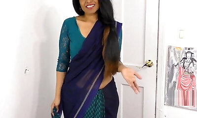 Tamil MILF Stepmother Stuck Under Bed with white saree & black blouse, when she cleaning under bed then son shag her