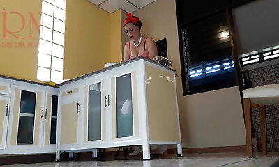 Nudist housekeeper Regina Noir cooking at the kitchen. Naked maid makes dumplings. Naked cooks. hooter-sling Three